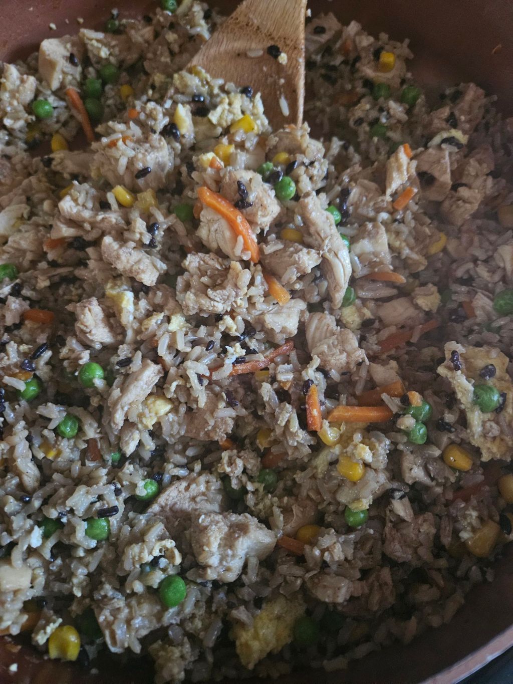 The cooking and assembly of this meal will take under 20 minutes, much less if you are using frozen rice and veggies and pre-cooked chicken (see the next section for tips to make this even quicker). Cook your desired amount of rice per package directions (unless you are using the frozen rice) and set aside. While the rice is cooking, heat a skillet to medium-high heat with your choice of oil (sesame is most authentic for the dish, but I use olive oil or avocado to avoid seed oils), add in cut up chicken breasts, and cook for about five minutes while stirring occasionally until cooked through. Push to the side and add fresh, cooked, or frozen veggies; note that fresh vegetables will take longer to cook and soften. Once the vegetables are cooked, add in the rice. Add in organic soy sauce or coconut aminos, fresh or dried garlic, onion powder (you can also use fresh onions and put in with the vegetables, but my husband is not an onion fan, so I stick to the powder), fresh or dried ginger, salt, and pepper. Cover the skillet for 3-5 minutes to let the flavors cook into the food. Once done, push the chicken, rice, and vegetables to the sides and pour beaten eggs into the middle of the skillet (I used four eggs for our family of 6). Cook through, then mix in with the rice mixture. Add in any other desired spices, and you are ready to serve!
