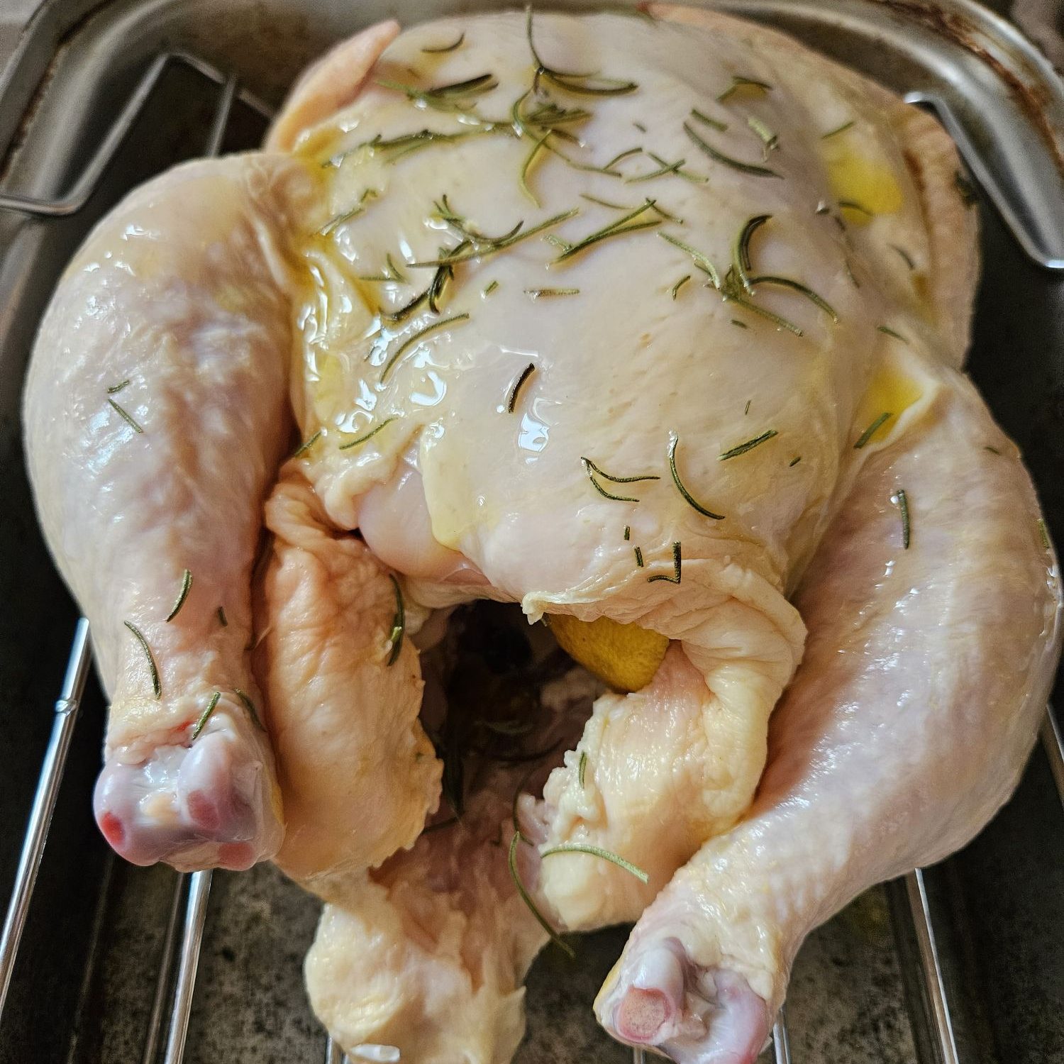 1. Thoroughly thaw chicken before cooking. Remove from packaging, rinse, and place on a wire rack inside a roasting pan, breast side up.