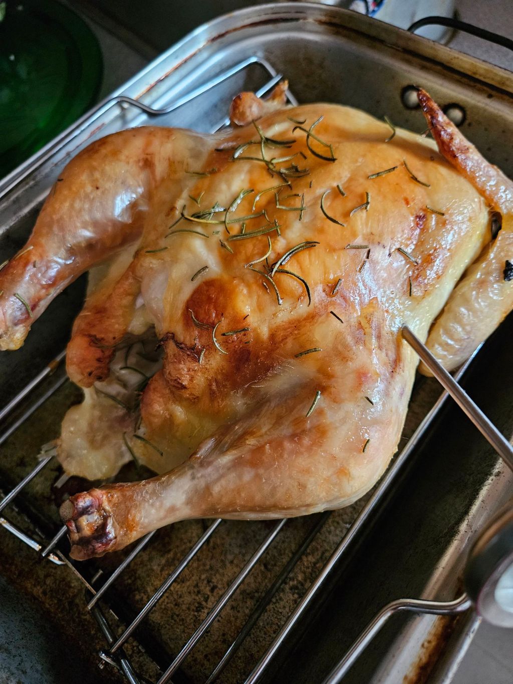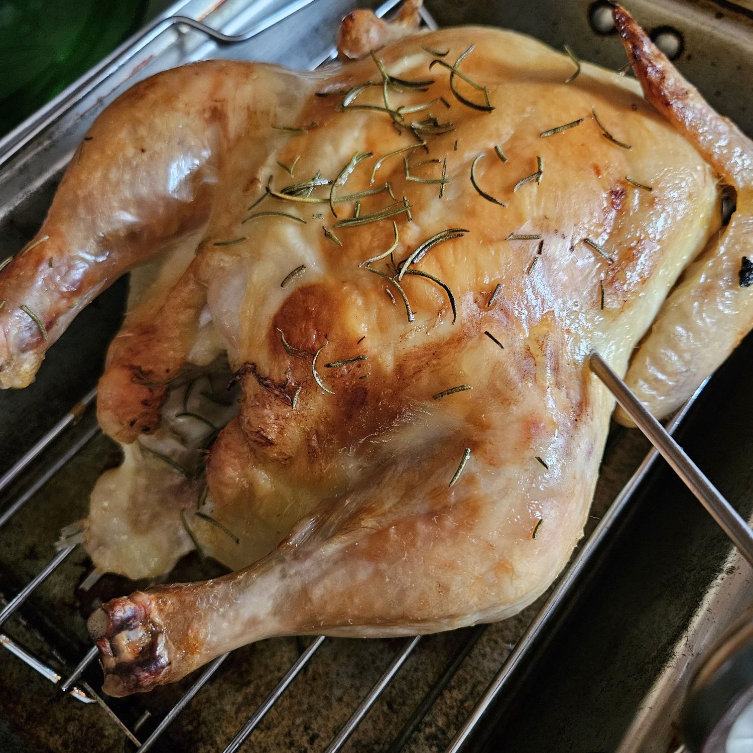 There are various ways to cook a whole chicken these days, and I enjoy all of them! I do like a classic oven-roasted chicken on a cool, icky weather day, which is exactly what we had last weekend. The wind was howling, and while the sun was out most of the day, it wasn’t particularly pleasant to be outside. I had been planning to grill something that afternoon, but quickly changed to a traditional Sunday chicken dinner. I had a 5 lb. organic, free-range whole chicken with no neck or giblets (always check for those before you cook a whole chicken!) I bought on sale a couple of days ago, so I pulled it out of the fridge and rinsed it off (clean/disinfect your sink after placing raw meat in it), then placed it breast-side up on the rack of the roasting pan I inherited from my great grandma. You can also use a wire rack inside of a 9×13 cake pan.