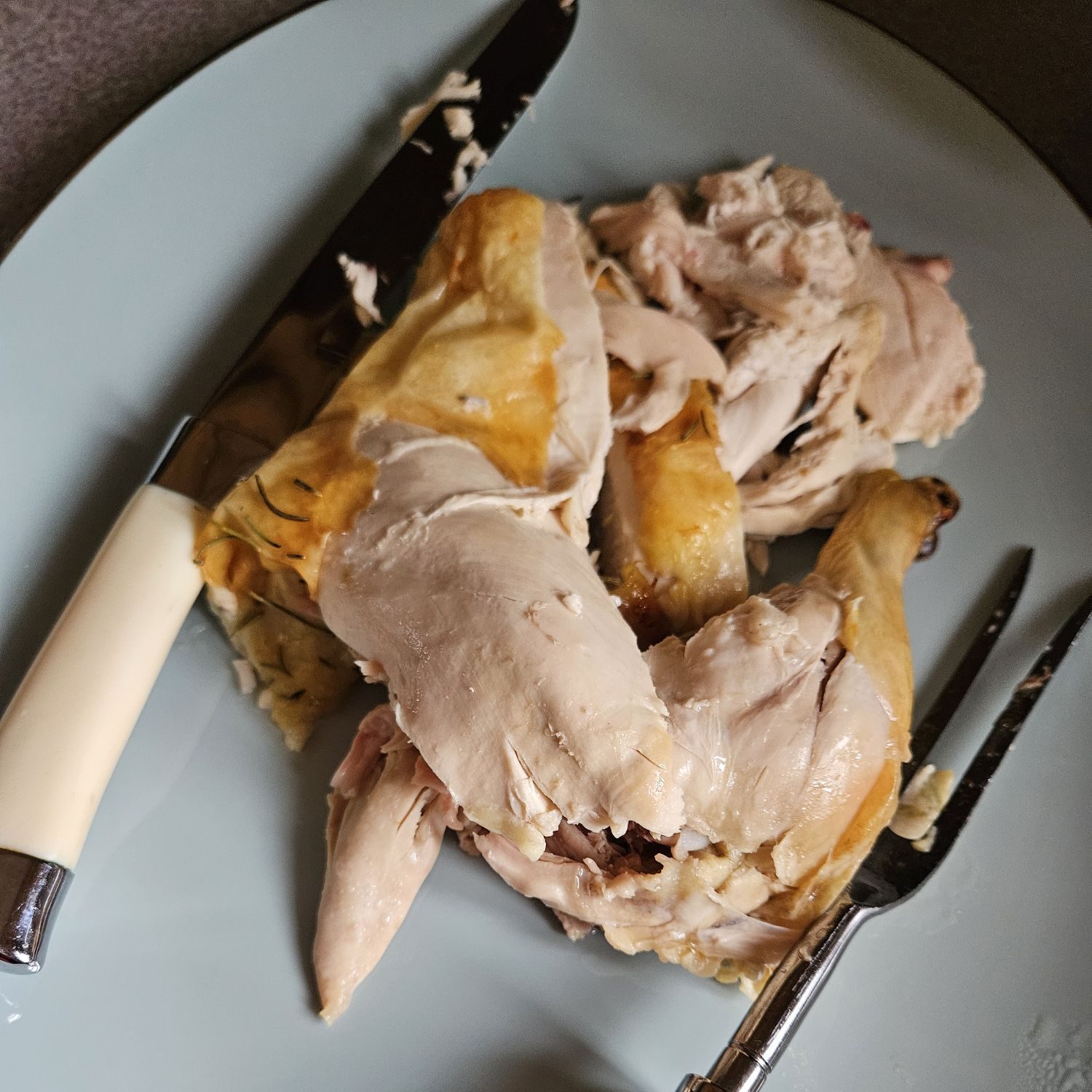 Bake at 350*F for two hours; I used the convection setting on my oven and it took a little less time than that. Use a meat thermometer to ensure the inner part of the breast is cooked to at least 165*F. Remove the chicken from the oven and let rest for 5-10 minutes. Remove from the pan, slice, and serve! Our meal was rounded out by sweet corn, fried potatoes, and sourdough baking powder drop biscuits. We did not have many leftovers!