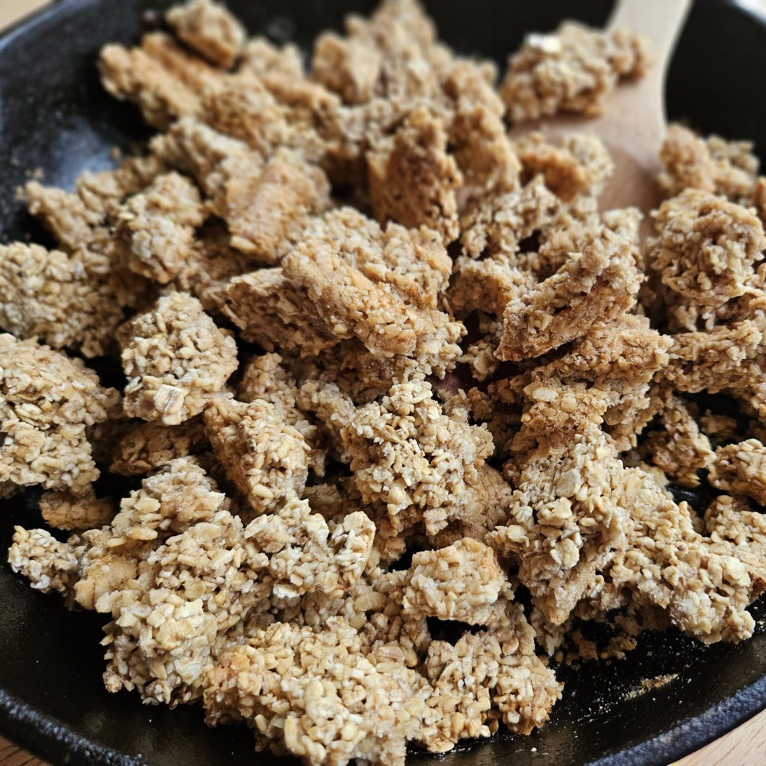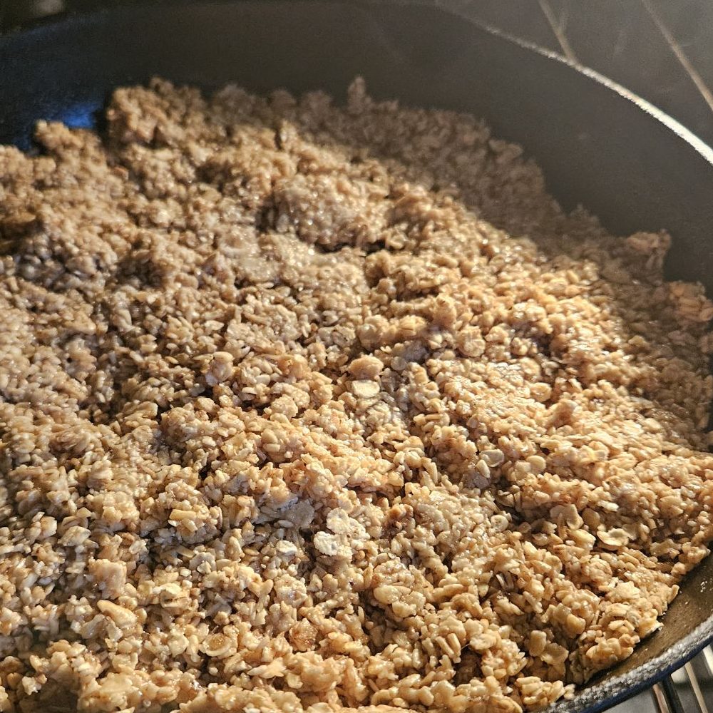 - Remove skillet, add in oil of preference. Press granola mixture into the skillet to an even thickness.