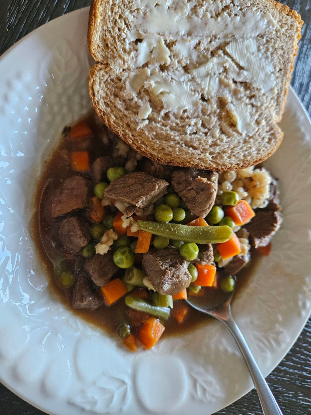 Fall is hunting season in our area, and we still have venison from last season’s hunt to use up before refilling our freezer. I am always finding new ways to use deer meat in place of beef cuts in our recipes, and our whole family really enjoys it! We had a particularly chilly and rainy day last week, so I decided soup and homemade bread were in order. While digging in our freezer, I realized we still had quite a bit of venison round steak cuts to use up, so I decided to thaw a couple of packages of those to use in some soup. (You could substitute beef or chicken easily in this recipe if that is your preference!) All I needed was some broth, barley, and vegetables, and dinner ingredients were assembled.