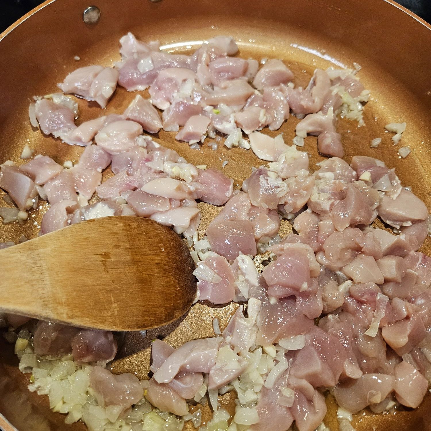 - Add flour, game, and onion to the pan and cook until the game is browned on all sides.
